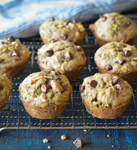Para terminar la masa de los muffins, agregue la calabacita y las chispas de chocolate a la mezcla de puré de manzana e incorpore. Agregue los ingredientes secos a la mezcla y revuelva para combinar. Agregue la mantequilla derretida y revuelva unas cuantas veces.